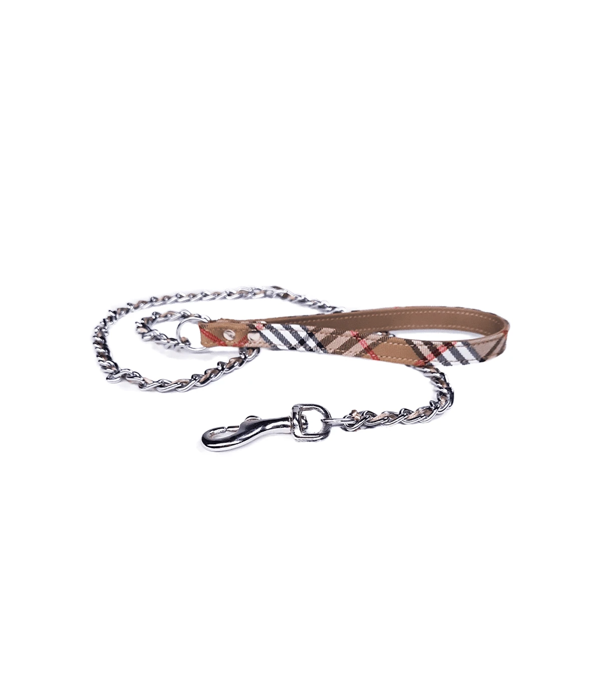 Laisse en chainette avec poignée en tissu écossais beige
