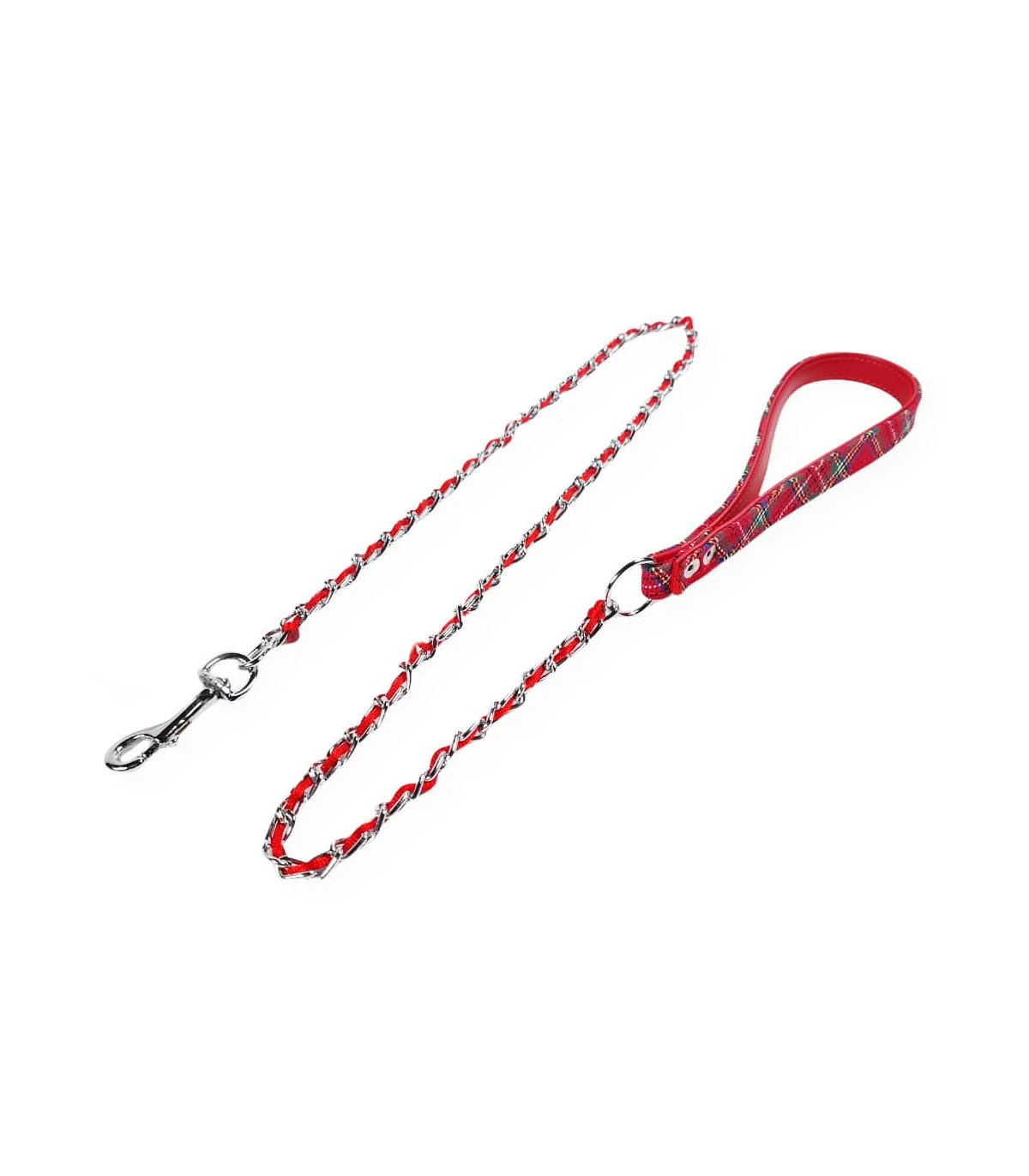Laisse en chainette avec poignée en tissu écossais rouge
