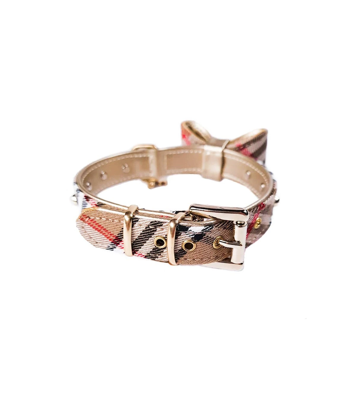 Collier en tissu écossais beige avec gros noeud à l’avant