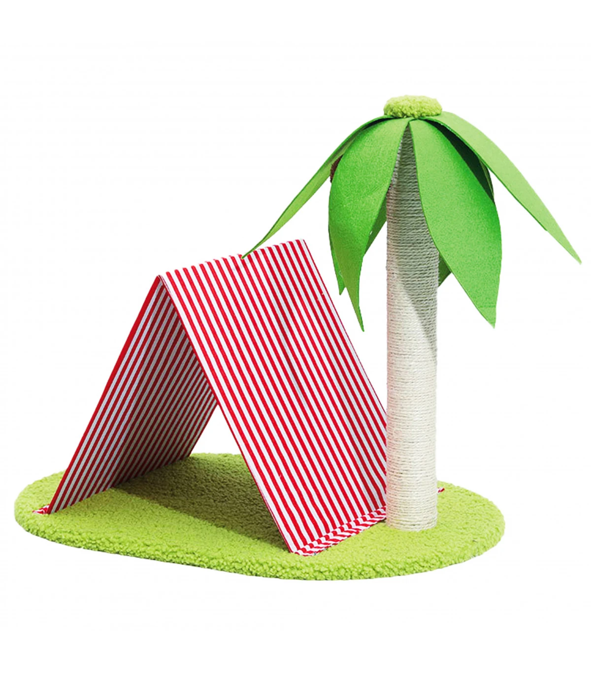 Arbre à chat avec cocotier et tente à rayures rouge et blanche