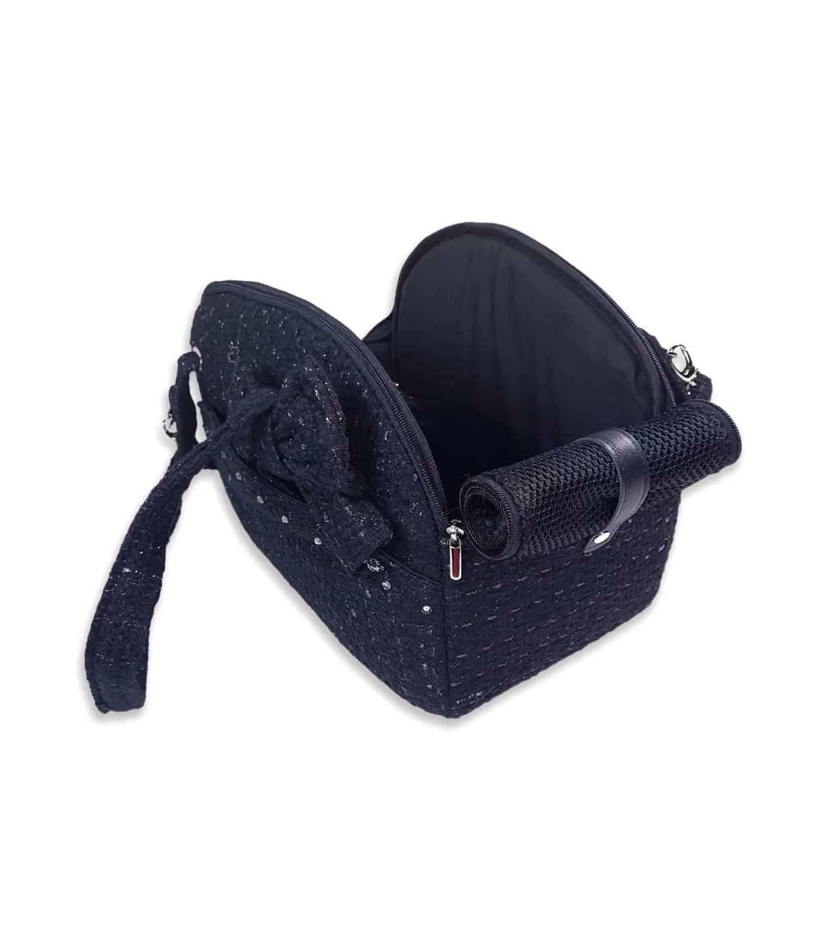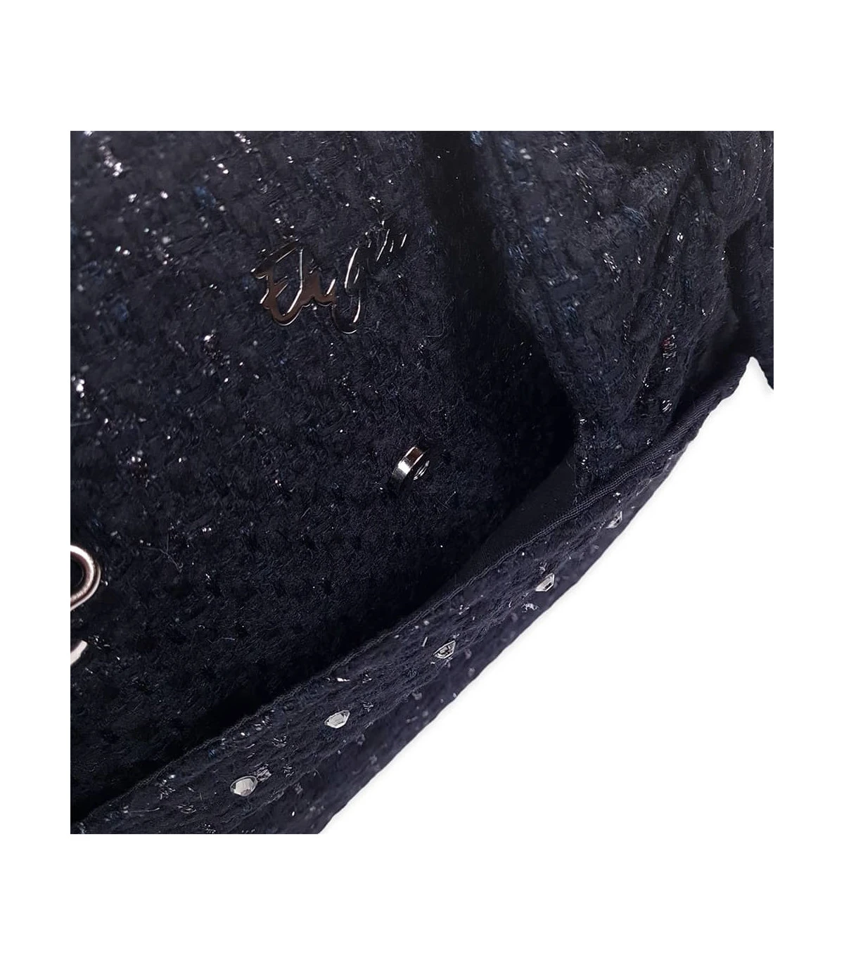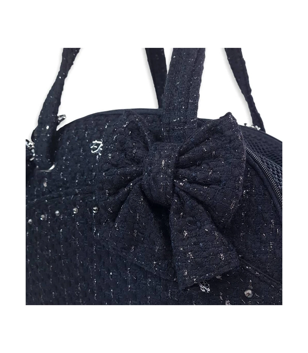 Sac de transport en tissu tweed noir chiné avec fils argentés à porter sur l’épaule ou en sling