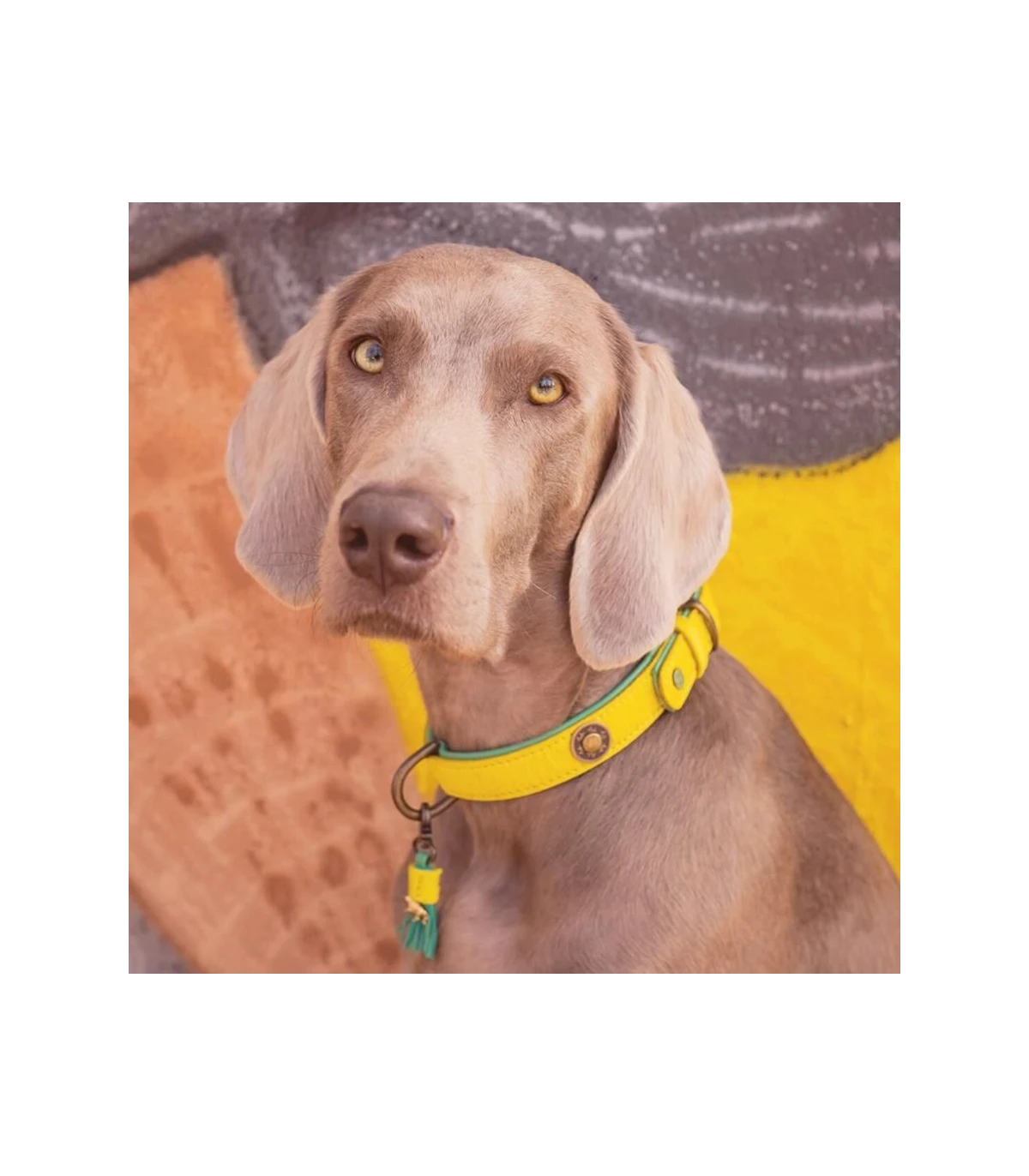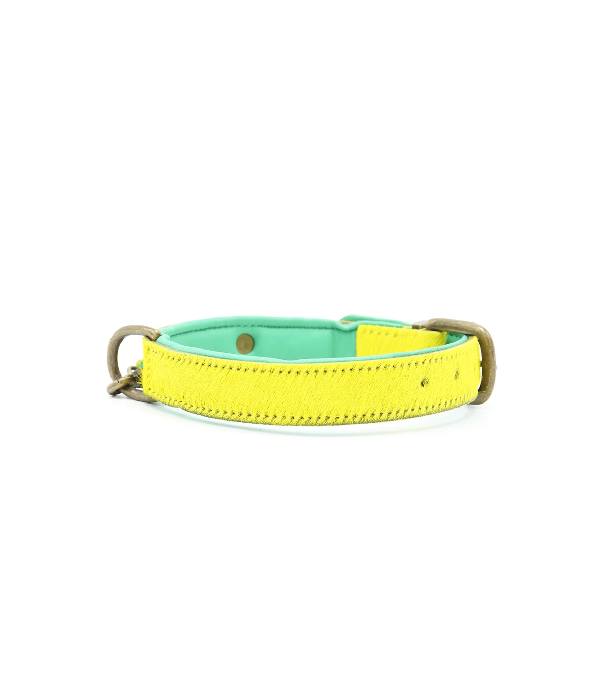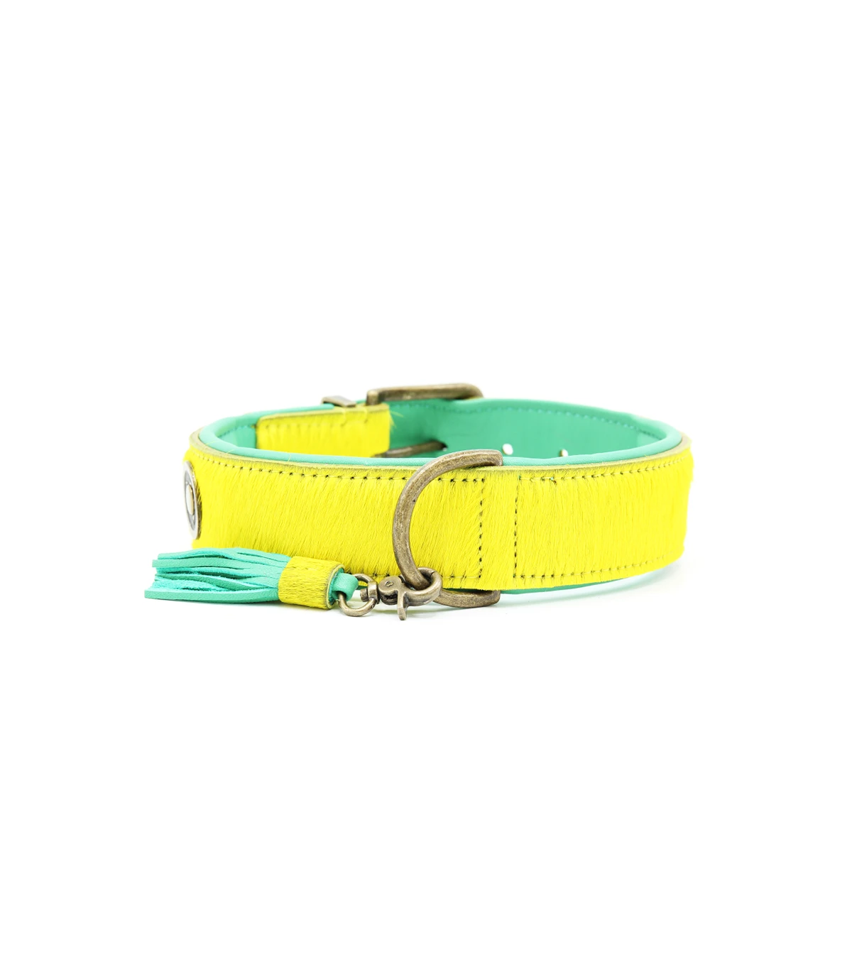 Collier en Cuir véritable fait Main, dessus en peau de chèvre teinté jaune.