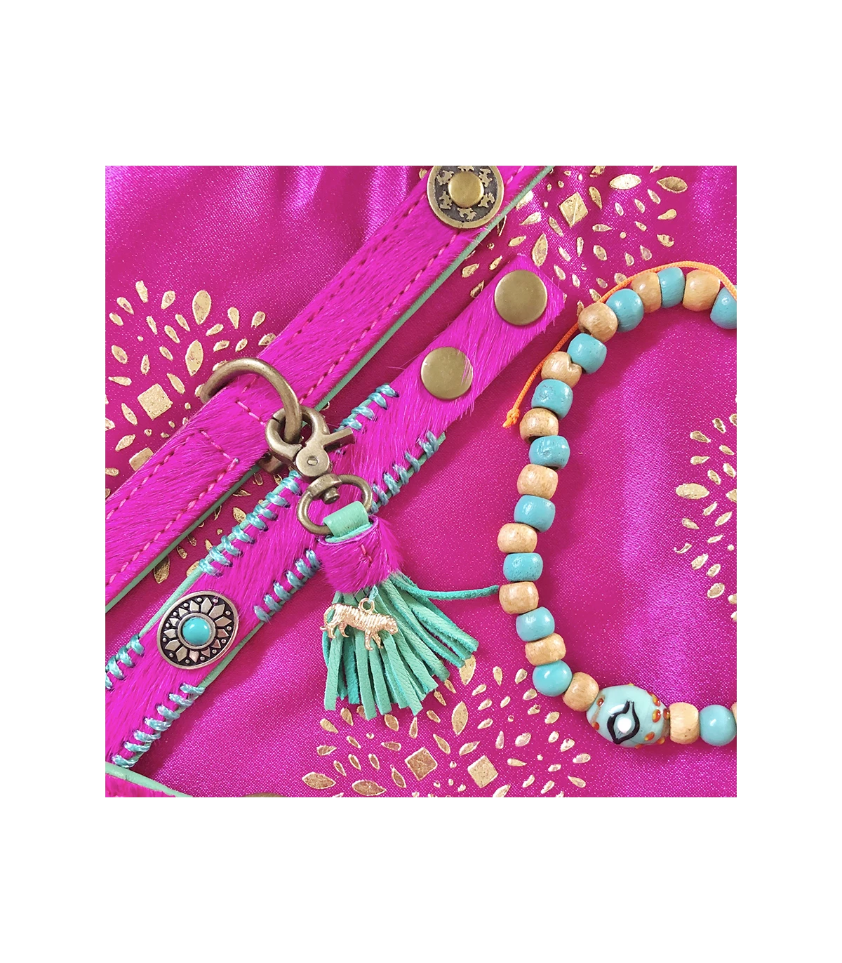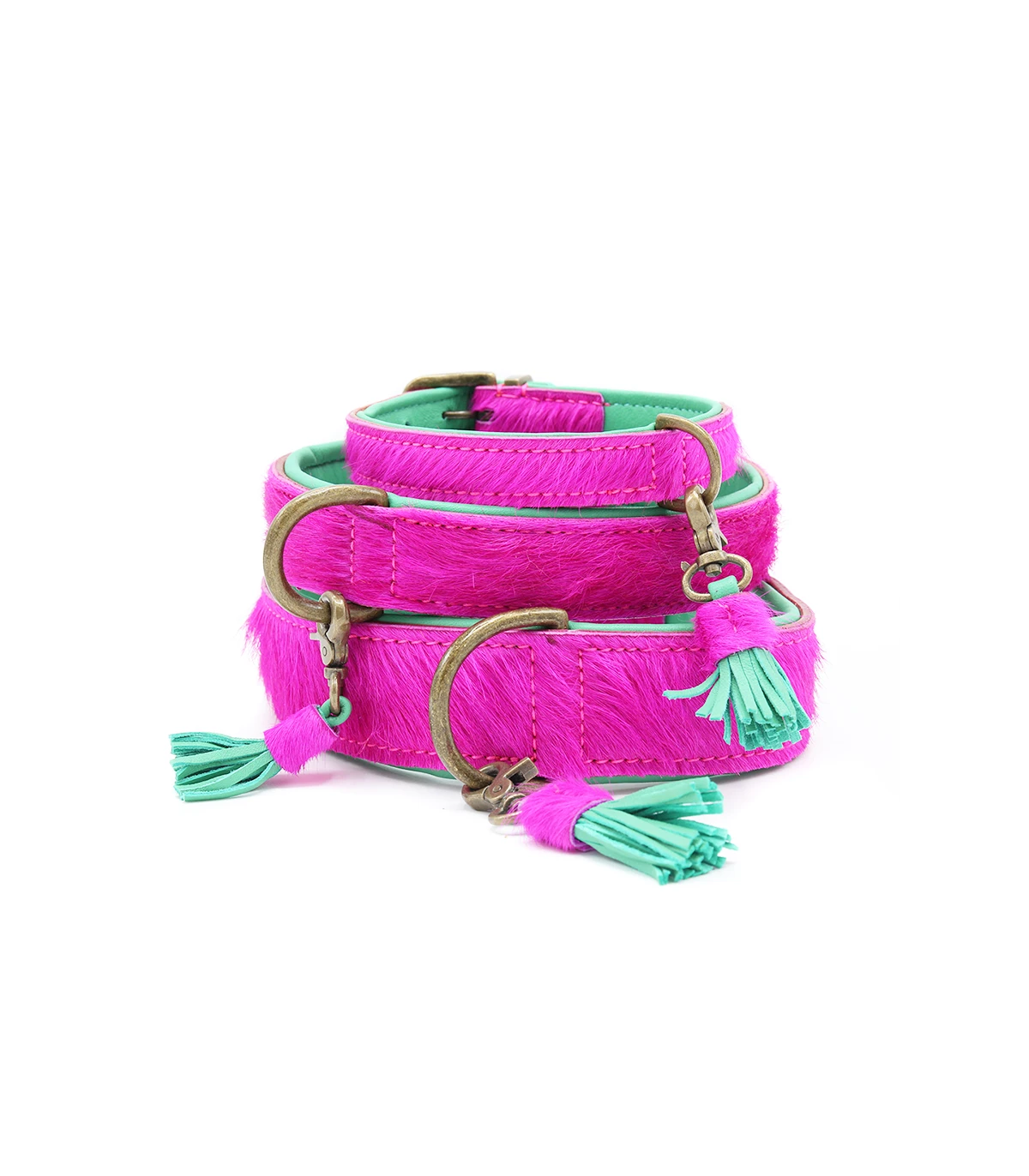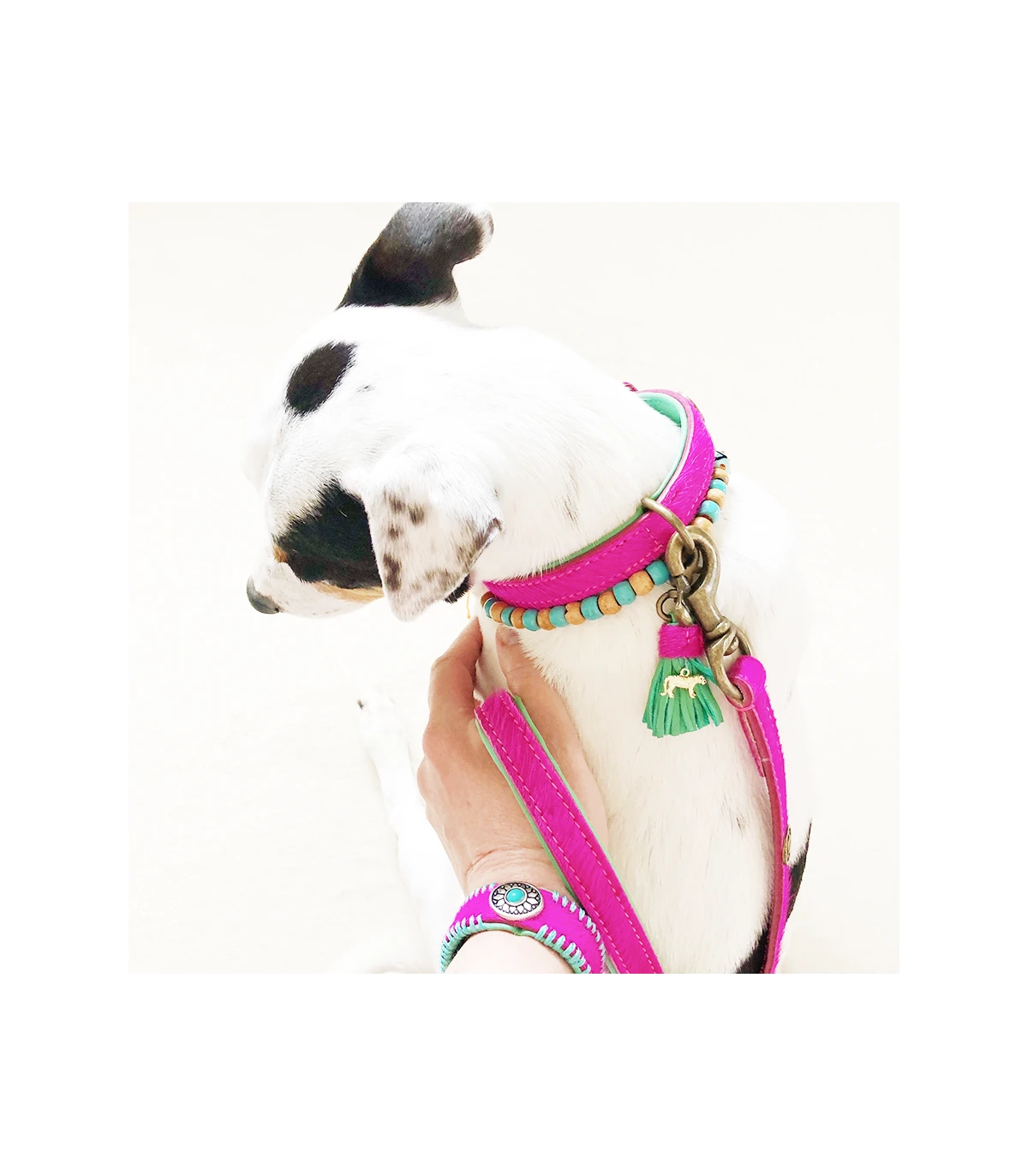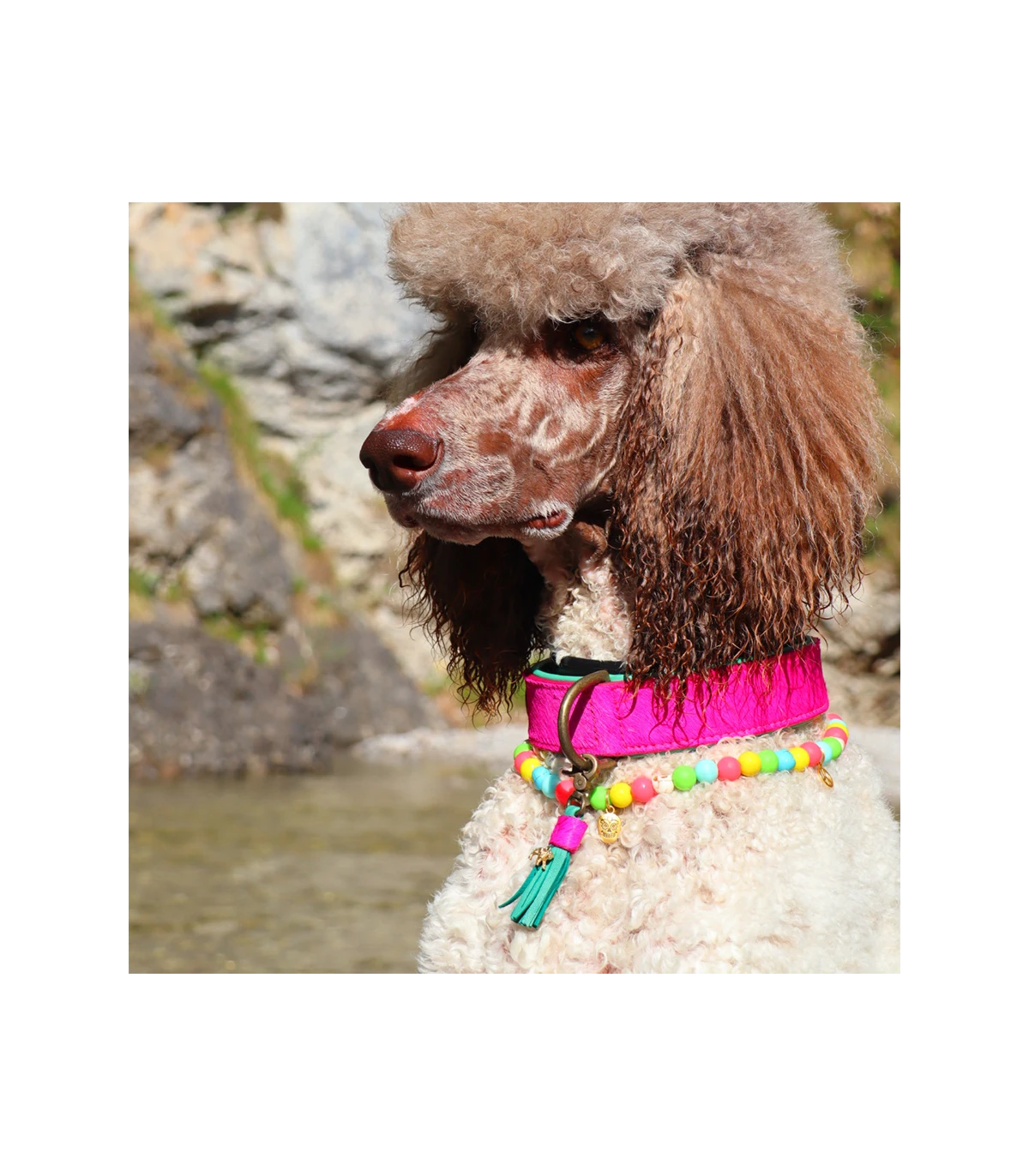Collier en Cuir véritable fait Main, dessus en peau de chèvre teinté rose intense.