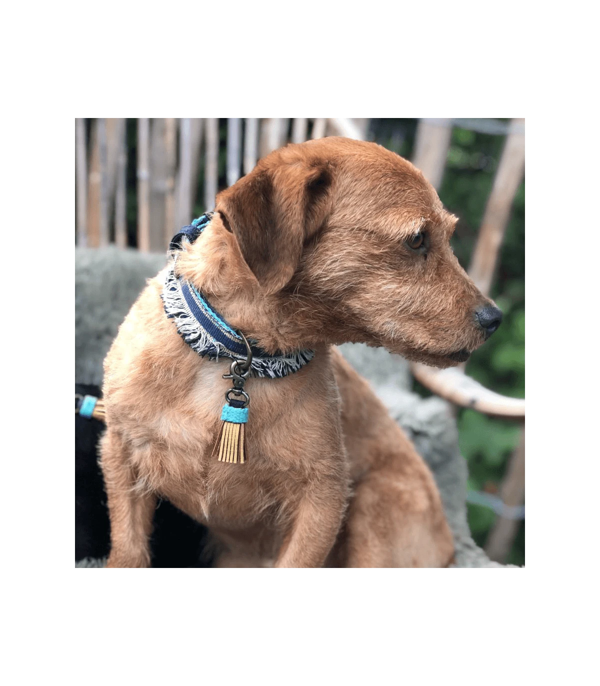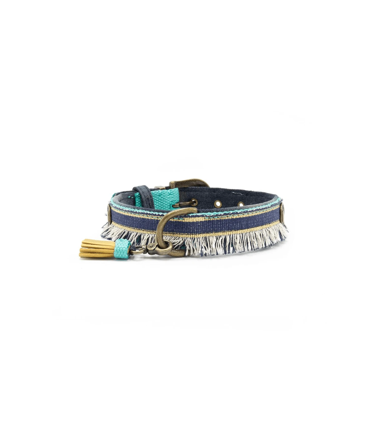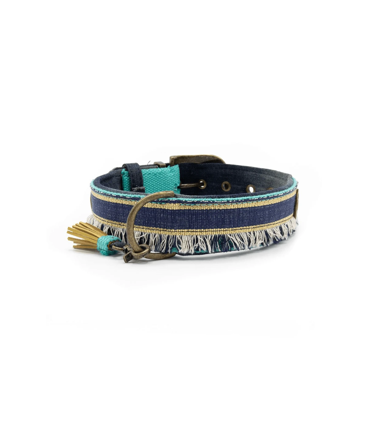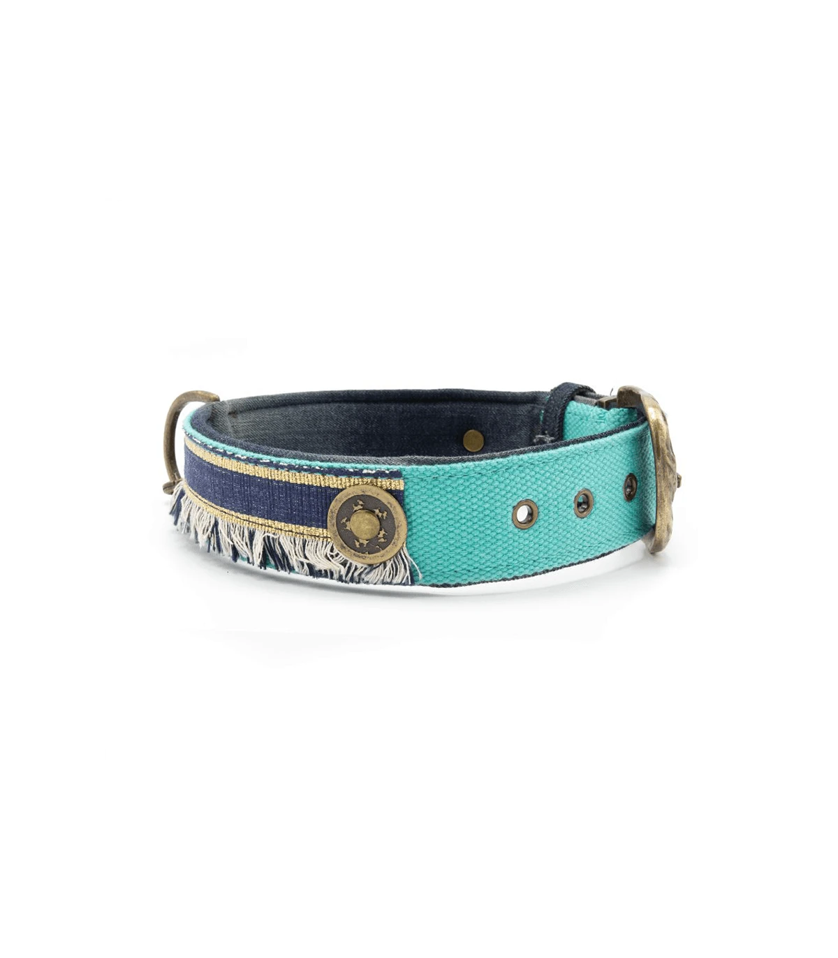 Collier en toile de couleur turquoise avec galon en denim brut avec finition éfiloché