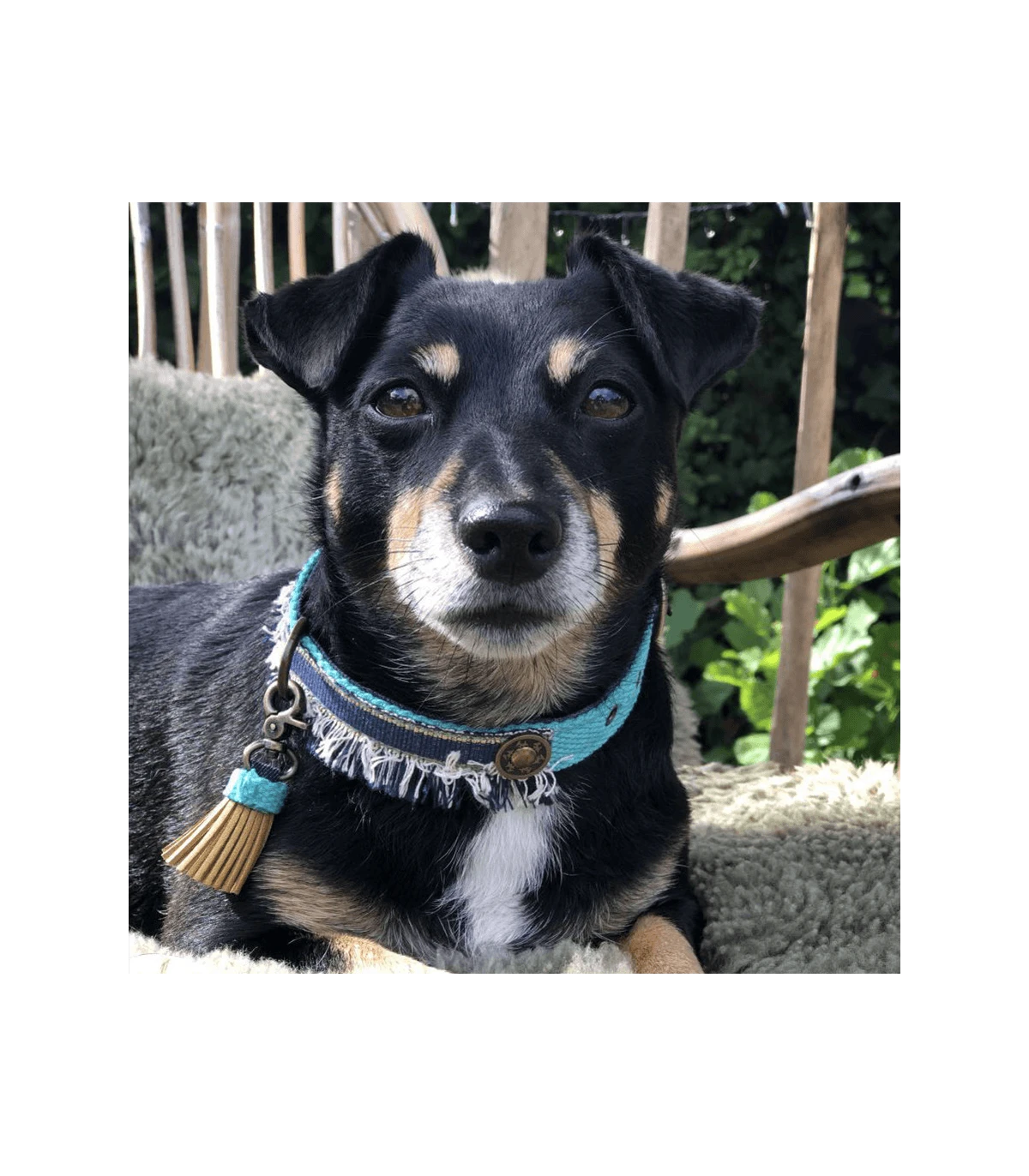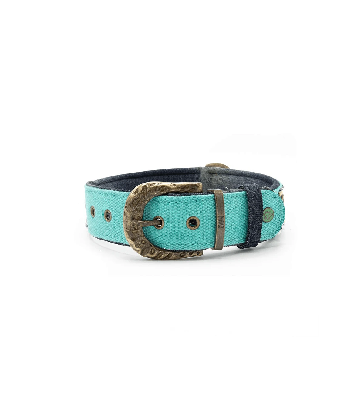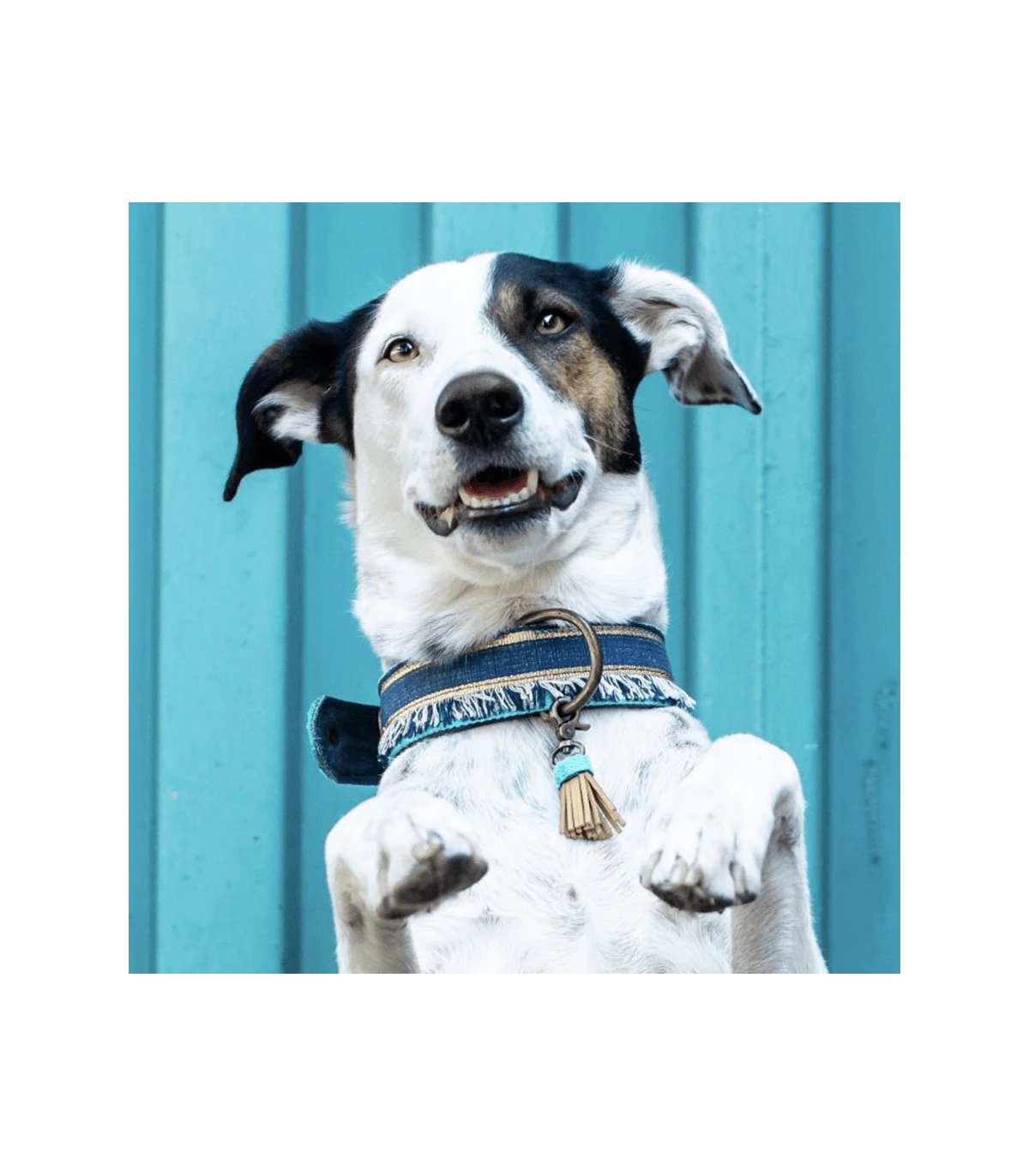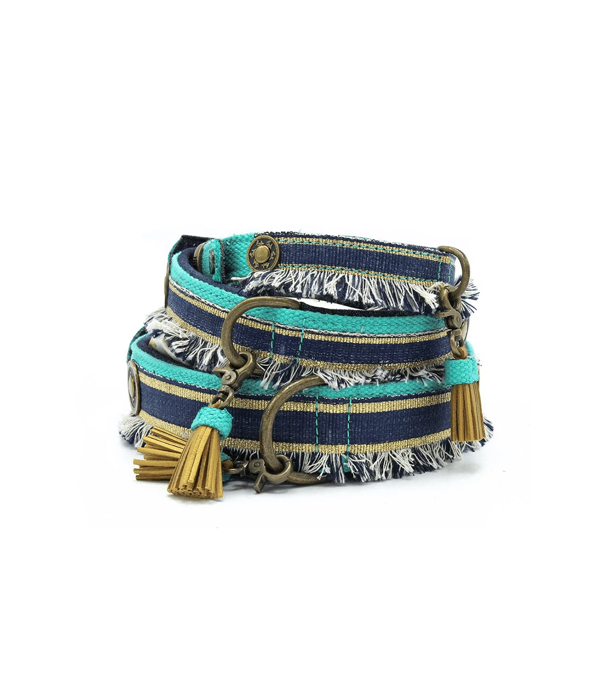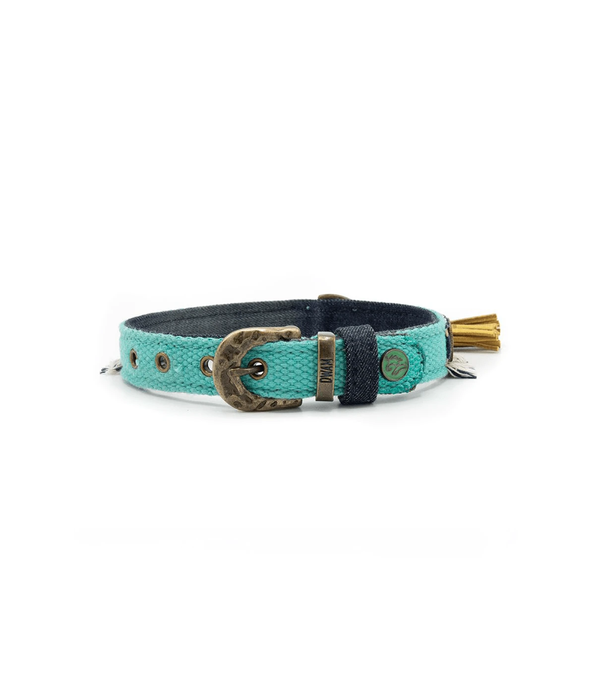 Collier en toile de couleur turquoise avec galon en denim brut avec finition éfiloché