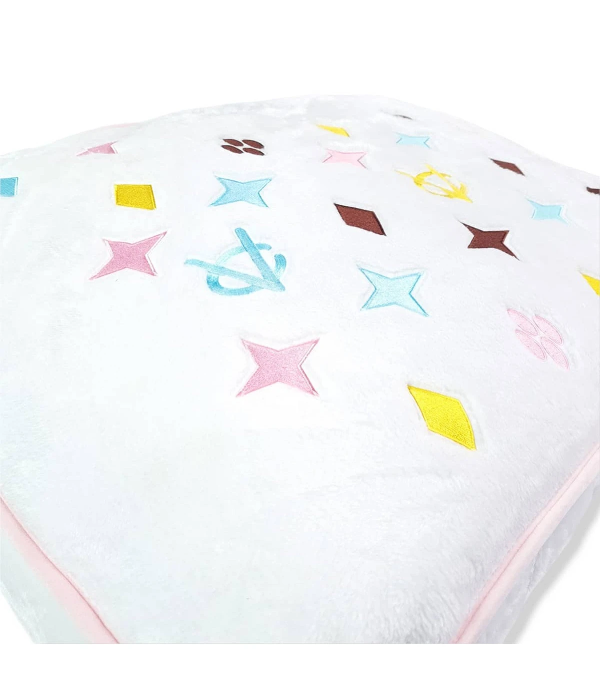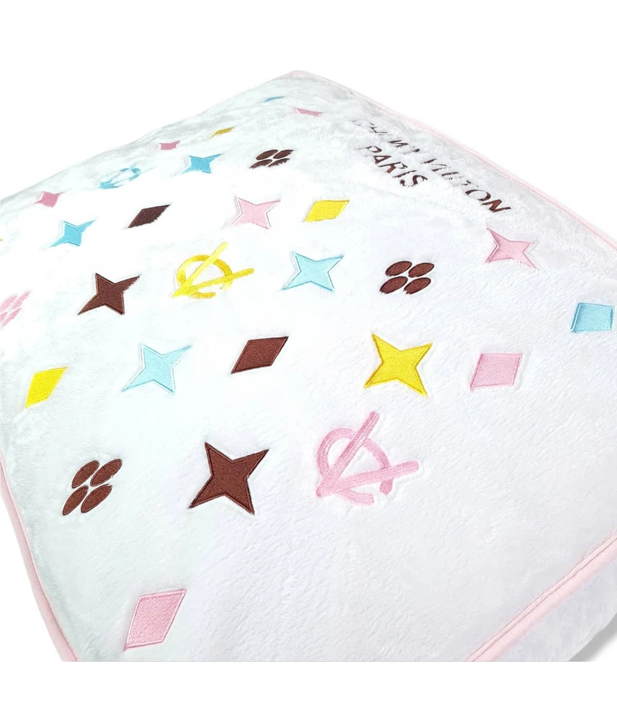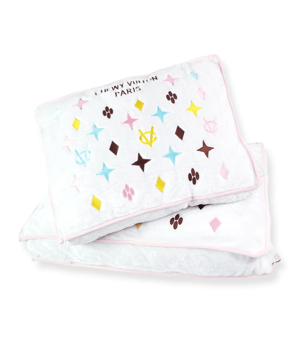 Coussin pour chien monogramme blanc et broderies pastel ,parodié d’une de nos marques préféré nous les femmes 🙂