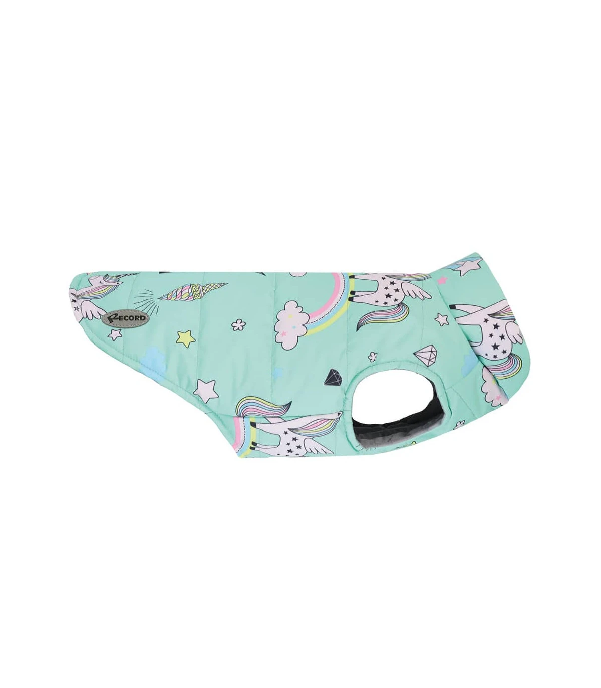 Doudoune vert d’eau en matière imperméable avec imprimé licorne et arc en ciel