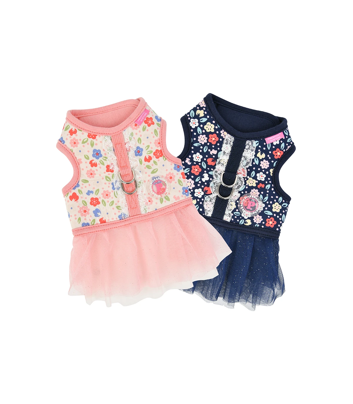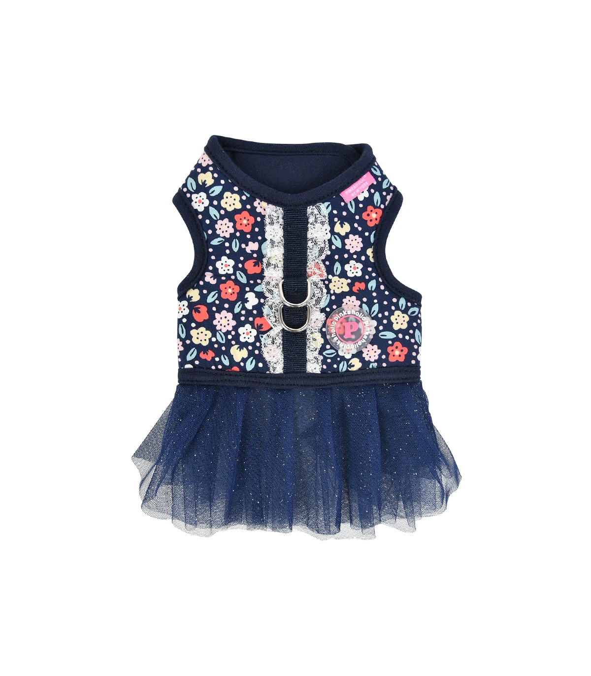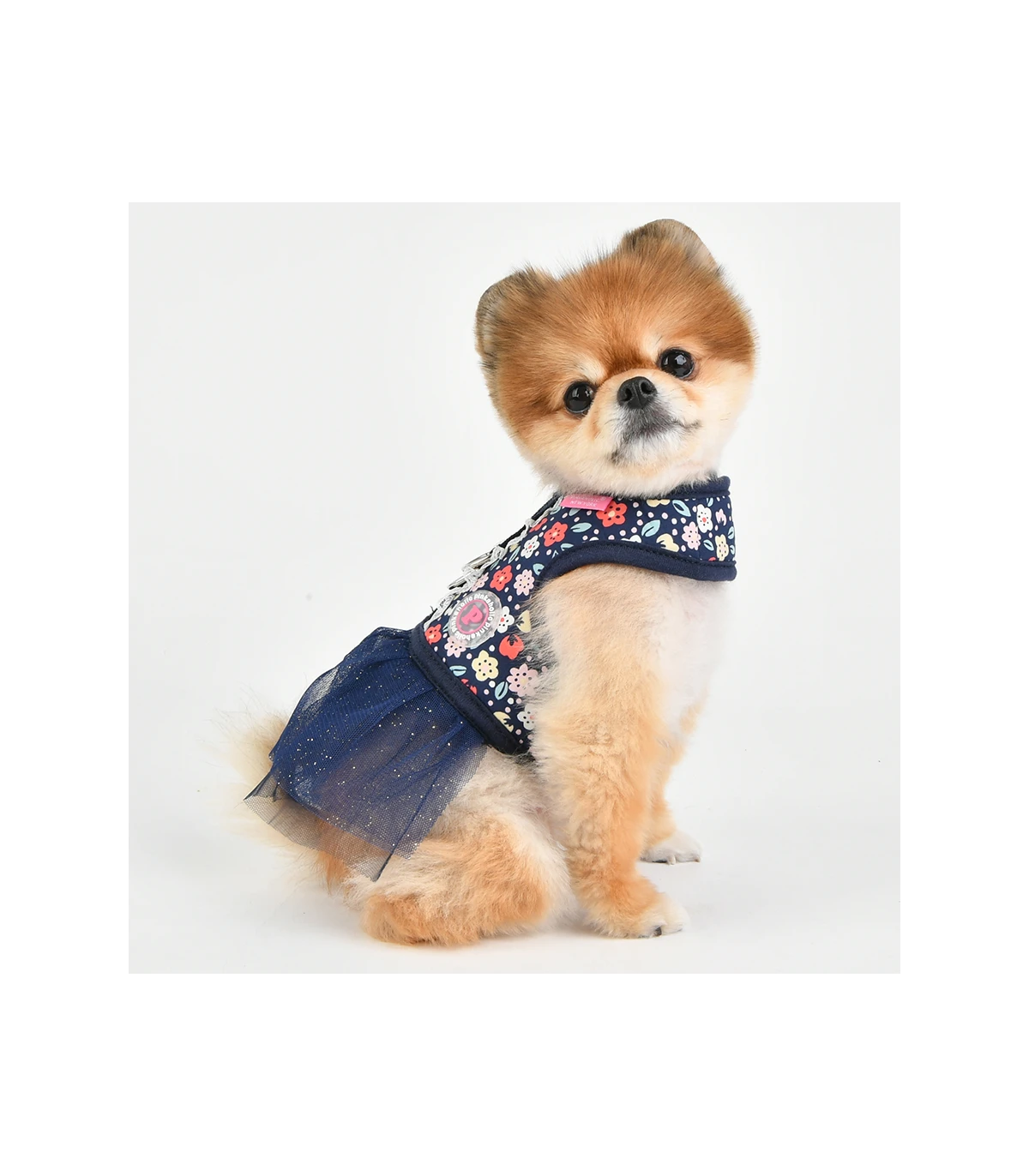Harnais veste imprimé fleuri avec jupette en tulle bleu marine pailleté.