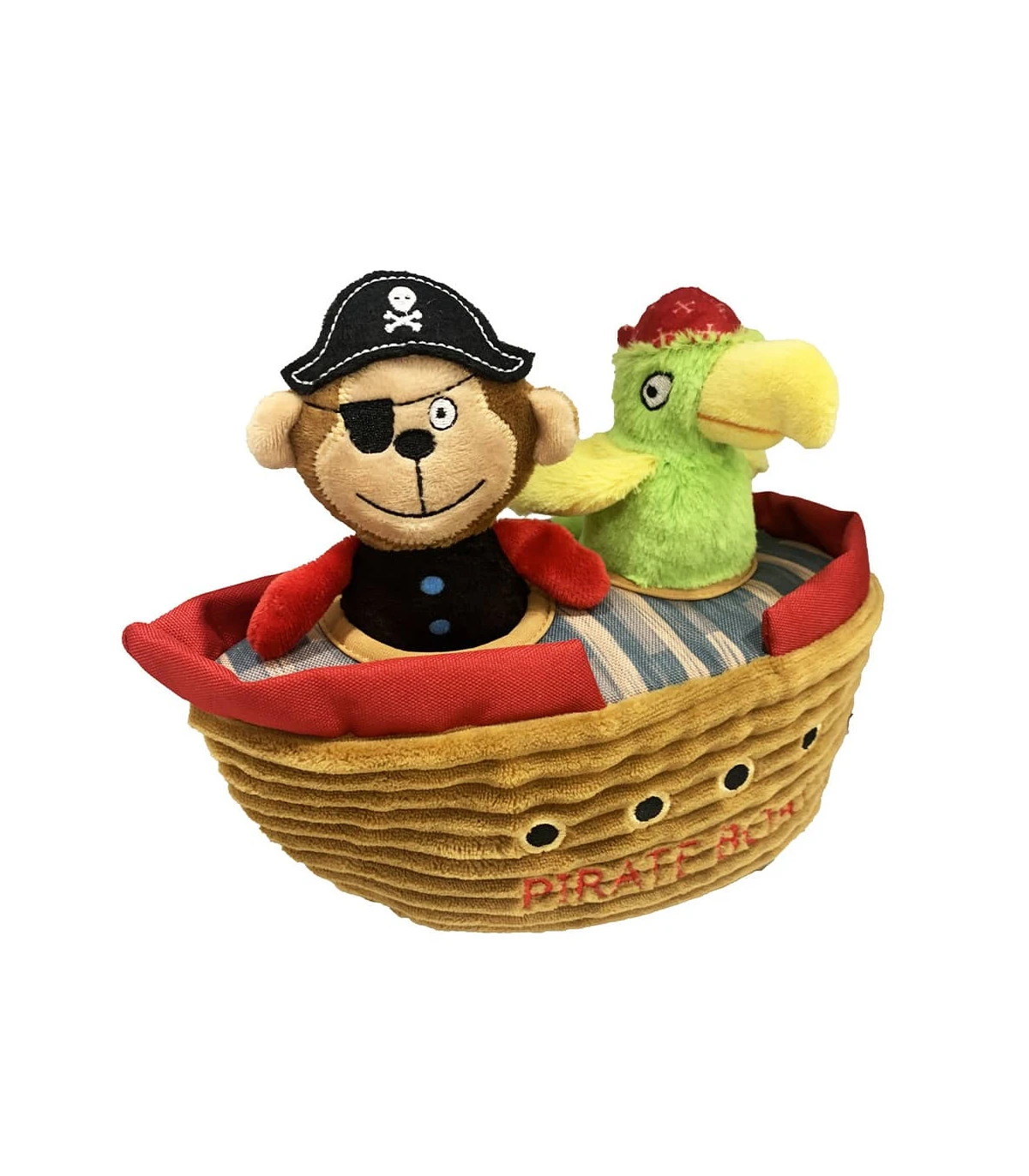 Jouet interactif bateau de pirate composé de 3 jouets couineurs en peluche ( 1 Pirate , 1 Perroquet , 1 bombe avec corde ) et un bateau à fourré