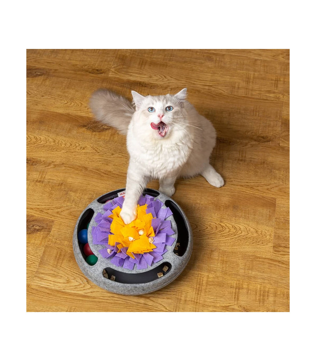 Votre matou va pouvoir glisser ses pattes pour essayer d’attraper les 6 balles colorés qui roulent dans tous les sens à l’intérieur