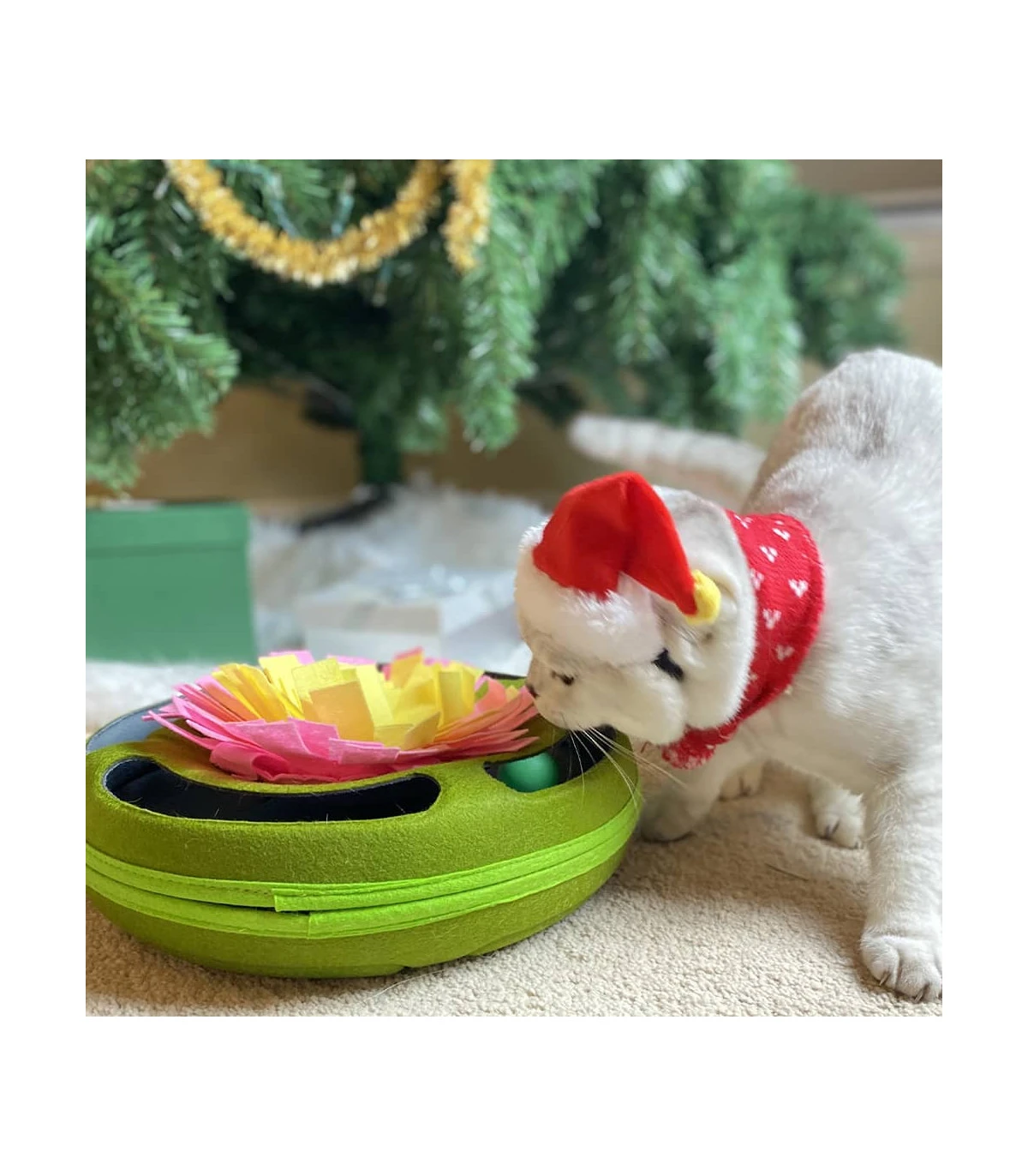 Jouet interactif en feutrine vert avec tapis de fouille sur le dessus