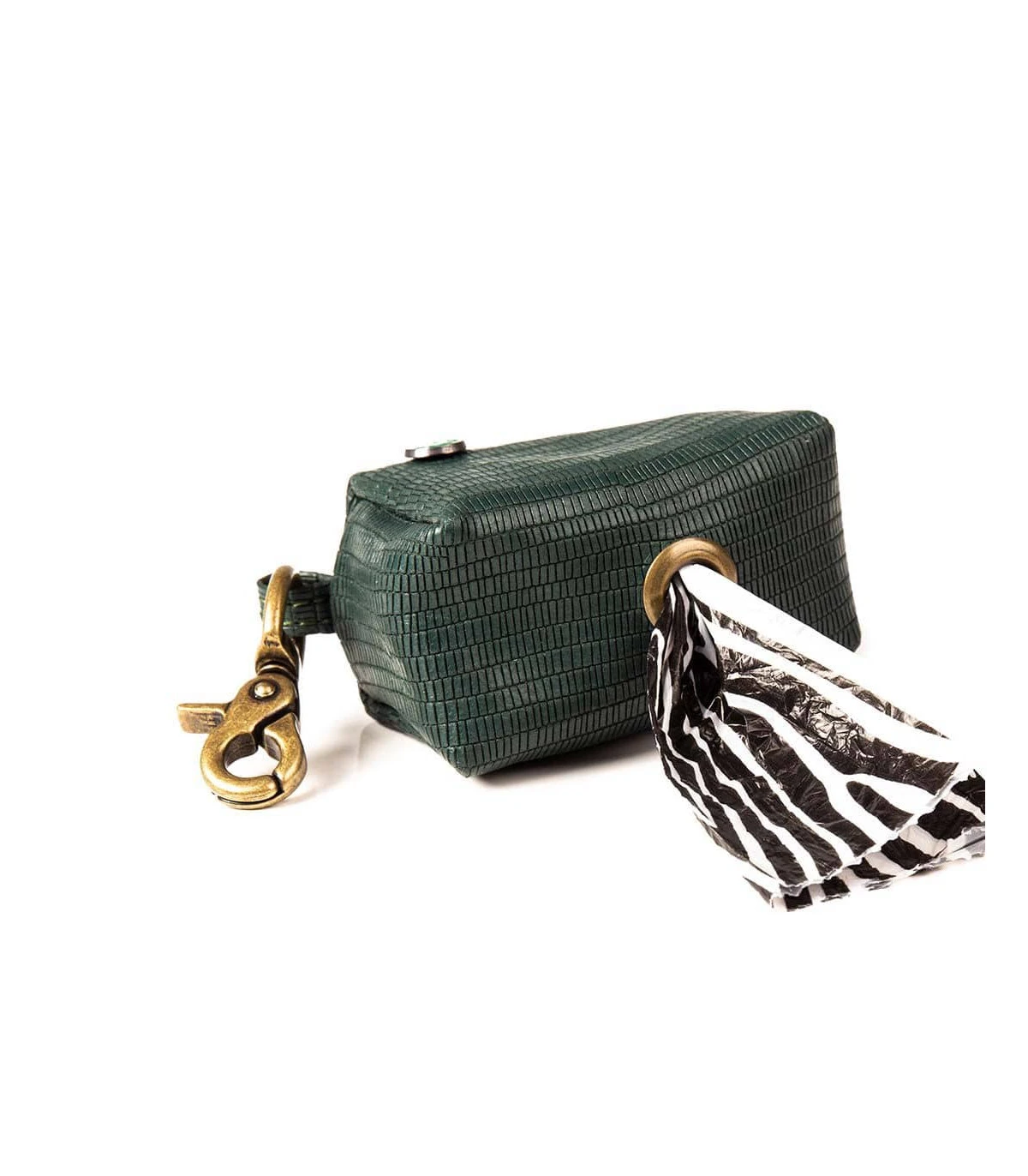 Pochette en en cuir vert bouteille imprimé lézard pour sachet Ramasse Crotte.