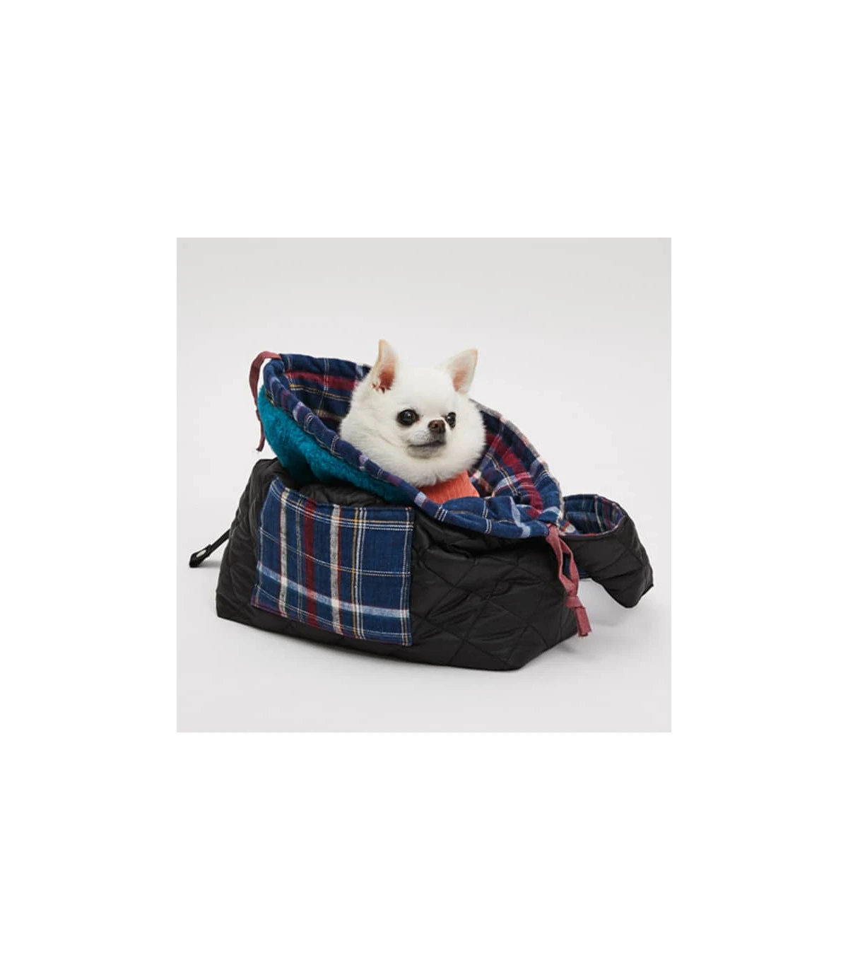 Sac de transport en tissu matelassé noir et intérieur en fausse fourrure bleu avec détail écossais bleu