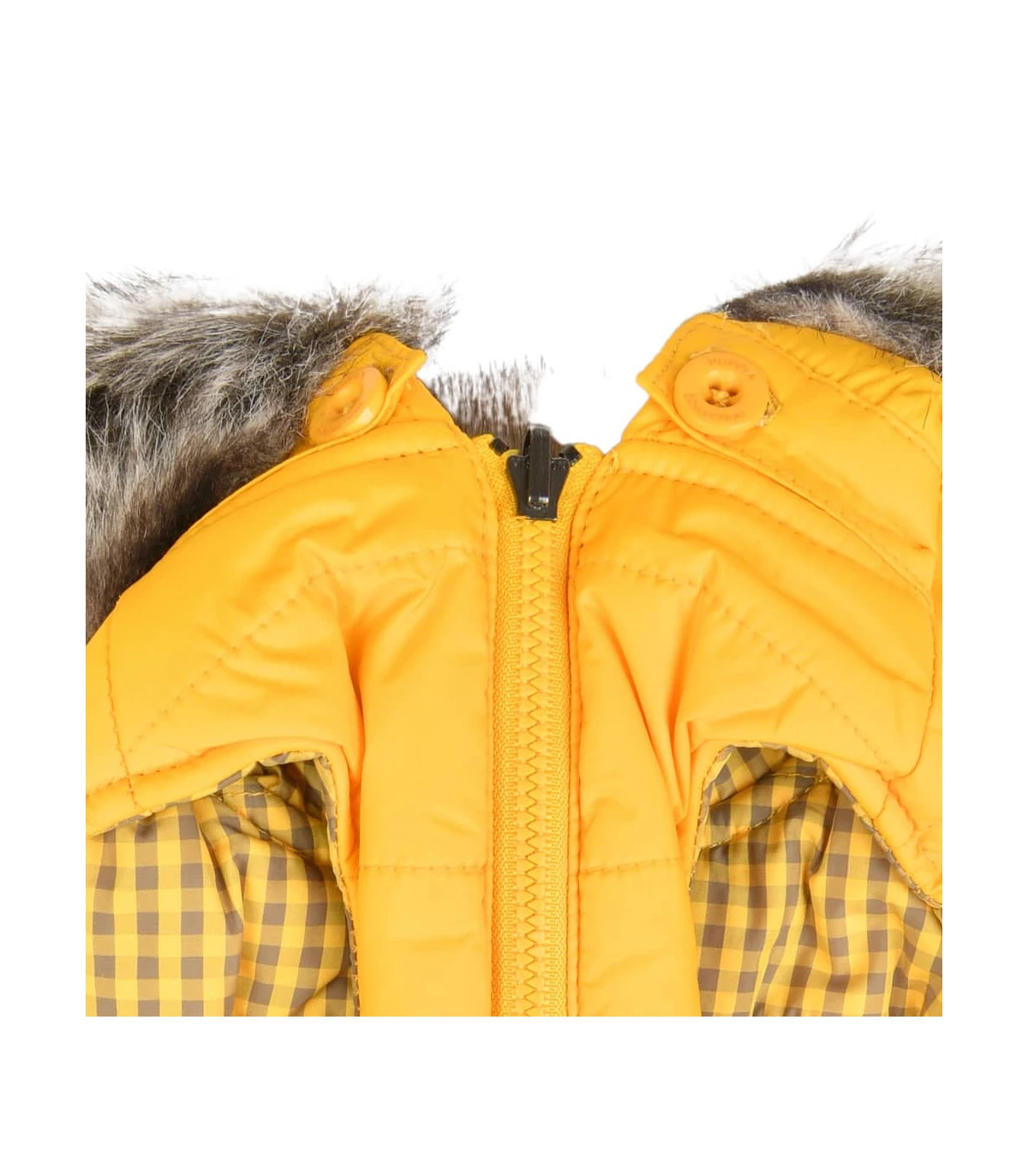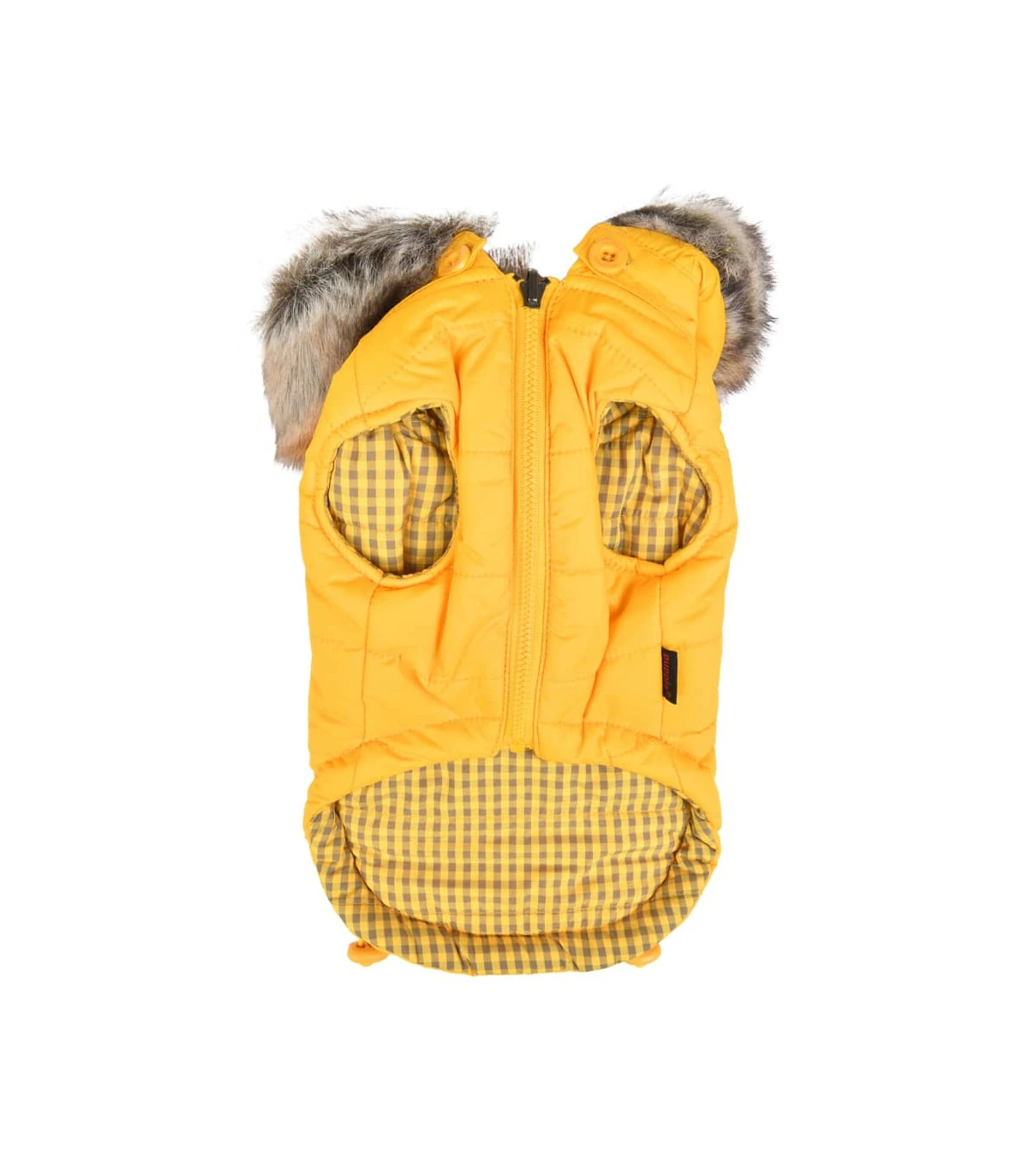 Doudoune reversible avec capuche en fausse fourrure ( un coté Jaune,un coté vichy jaune et noir selon vos envies )
