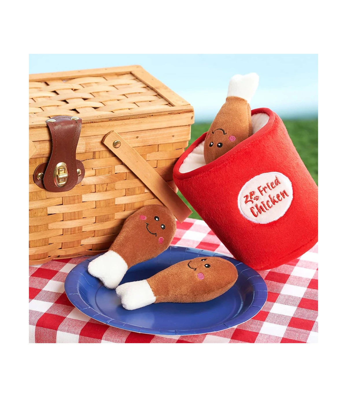 Composé à l’intérieur de trois petites peluche en forme de Pilons de Poulet qui couine quand on les croques